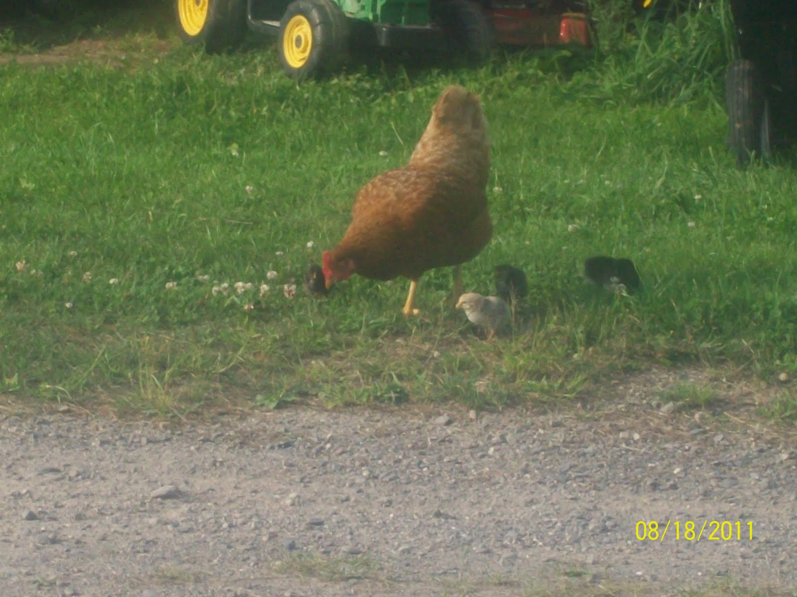 Our little chicks are doing well. They survived the tropical storm. We locked them in the cow barn. Much to mama's distaste for that. Her nest was behind the barn in the tall grass, not under the barn like we had thought. So we decided because it made us feel better that they would spend the night in the barn with Maggie. We figured it would be better for them. Although I have to admit that they seem like they are much more hardy then the chicks that we raise from a day old. These guys are out in the rain, wind and it's not 95-100 degrees like the light raised ones are. They are 12 days old according to when we saw them. Maybe 13 if they stayed in their nest for a day. They peck and scratch much more too, looking for bugs and such. Mama hen is doing a great job with them. It's fun to listen to her talk to them. Her tone changes depending on what is going on, and watching them respond accordingly. None of the other hens bother with them anymore either, because mama comes at them!